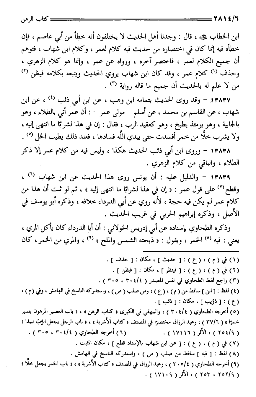 13838 - وروى ابن أبي ذئب الحديث هكذا، وليس فيه من كلام عمر إلا ذكر الطلاء، والباقي من كلام الزهري.