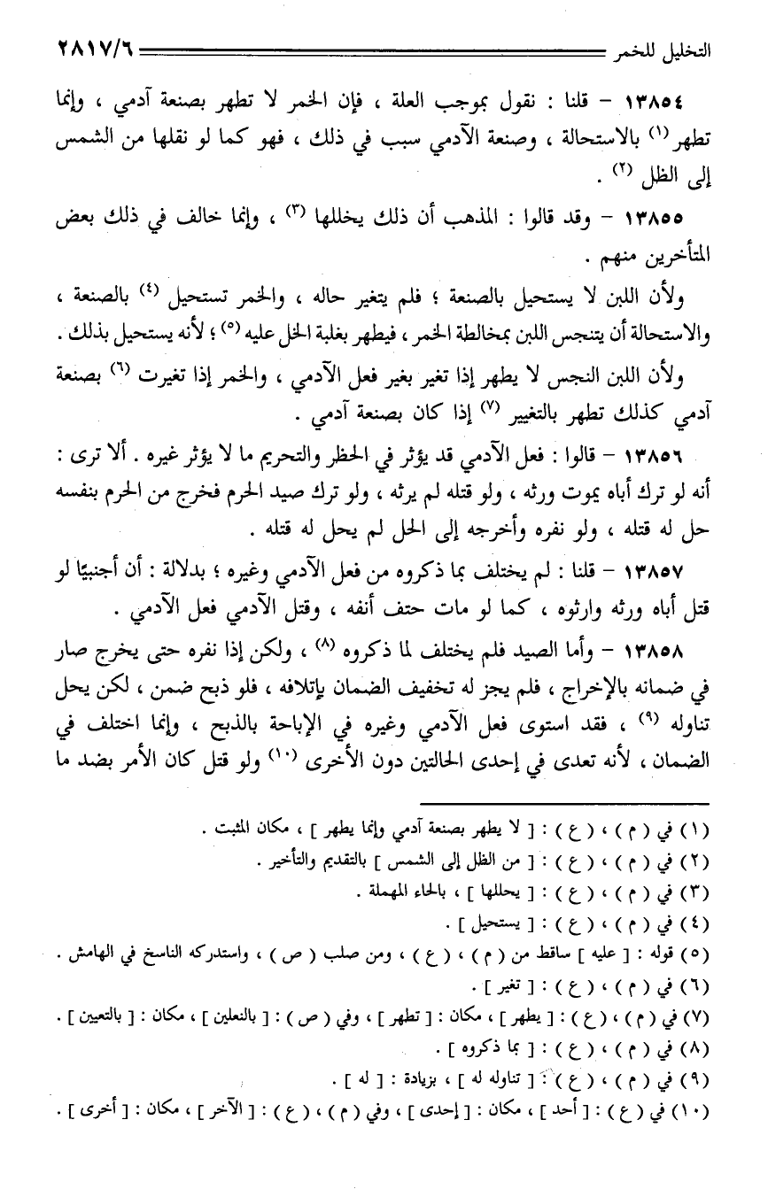 13854 - قلنا: نقول بموجب العلة، فإن الخمر لا تطهر بصنعة آدمي، وإنما تطهر بالاستحالة، وصنعة الآدمي سبب في ذلك، فهو كما لو نقلها من الشمس إلى الظل.