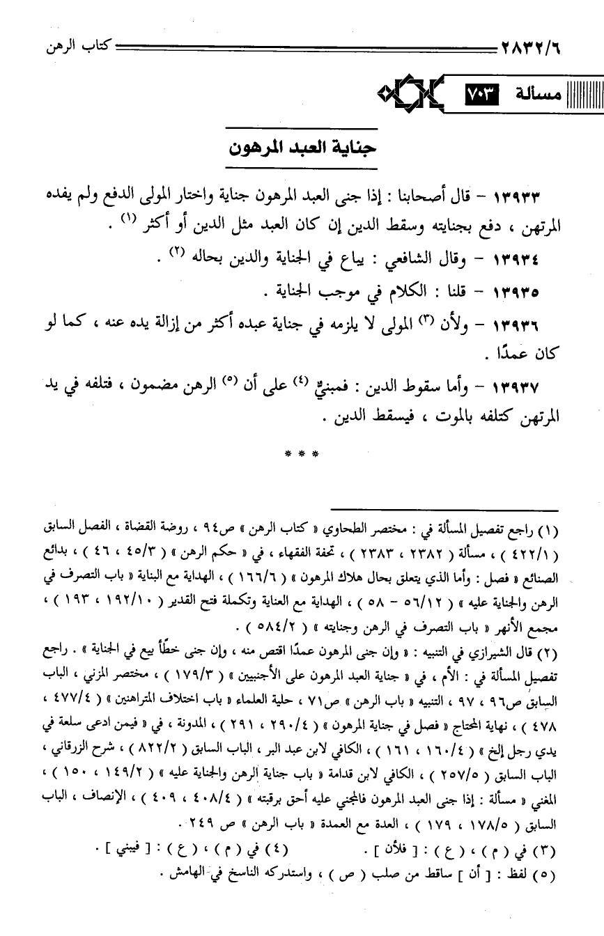 13933 - قال أصحابنا: إذا جنى العبد المرهون جناية واختار المولى الدفع ولم يفده المرتهن، دفع بجنايته وسقط الدين إن كان العبد مثل الدين أو أكثر.