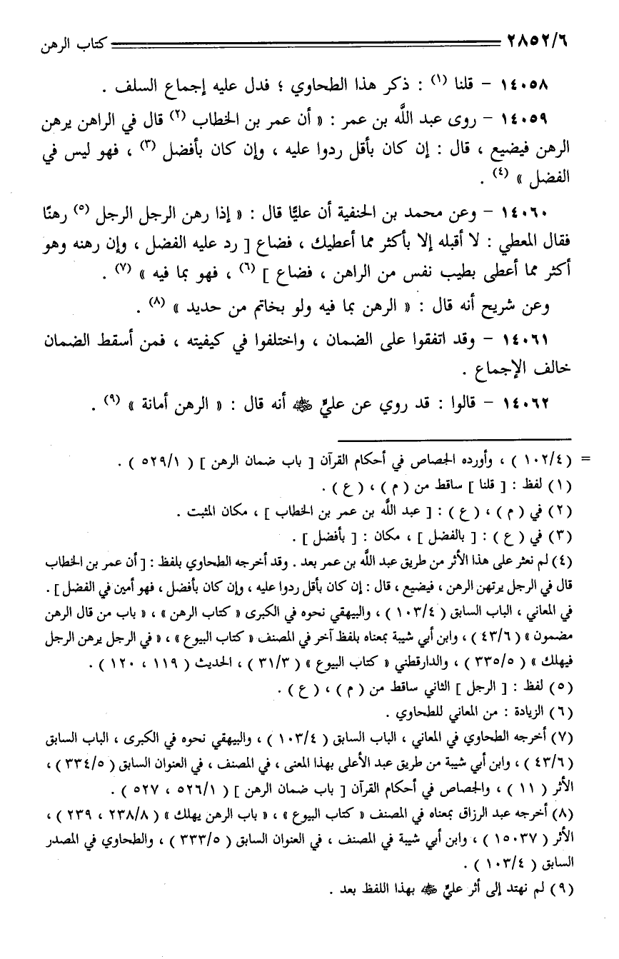 14059 - روى عبد الله بن عمر: (أن عمر بن الخطاب قال في الراهن يرهن الرهن فيضيع، قال: إن كان بأقل ردوا عليه، وإن كان بأفضل، فهو ليس في الفضل).
