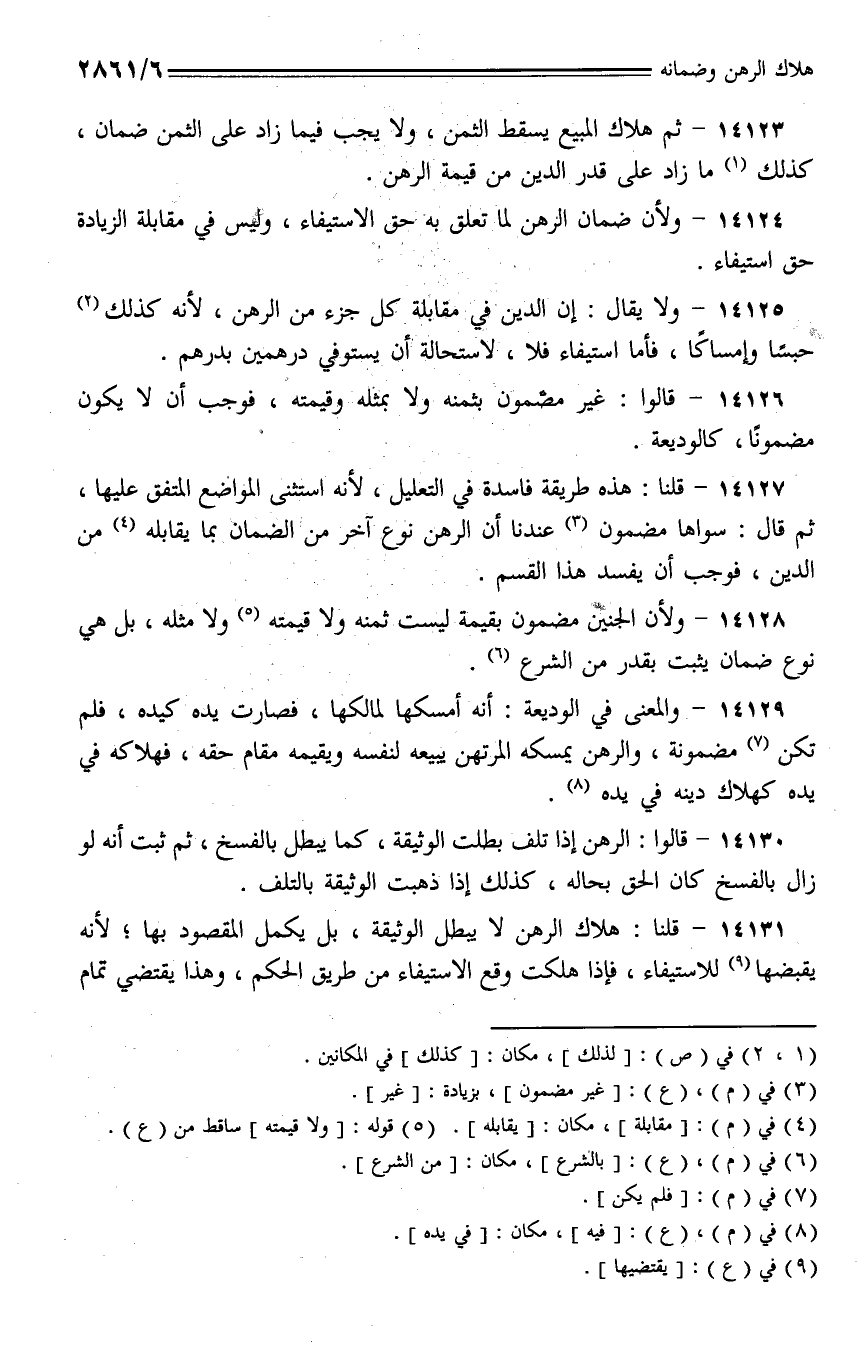 14123 - ثم هلاك المبيع يسقط الثمن، ولا يجب فيما زاد على الثمن ضمان، كلك ما زاد على قدر الدين من قيمة الرهن.