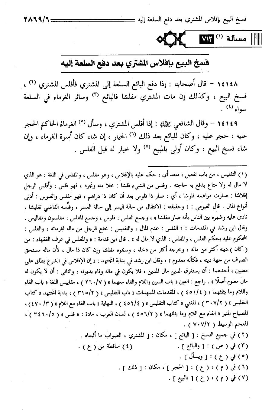 14149 - وقال الشافعي رحمه الله: إذا أفلس المشتري، وسأل الغرماء الحاكم الحجر عليه، حجر عليه، وكان للبائع بعد ذلك الخيار، إن شاء كان أسوة الغرماء، وإن شاء فسخ البيع، وكان أولى بالمبيع ولا خيار له قبل الفلس.