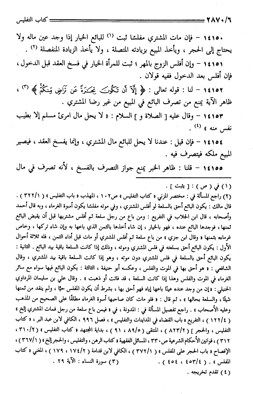 14150 - فإن مات المشتري مفلسا ثبت للبائع الخيار إذا وجد عين ماله ولا يحتاج إلى الحجر، ويأخذ المبيع بزيادته المتصلة، ولا يأخذ الزيادة المنفصلة.