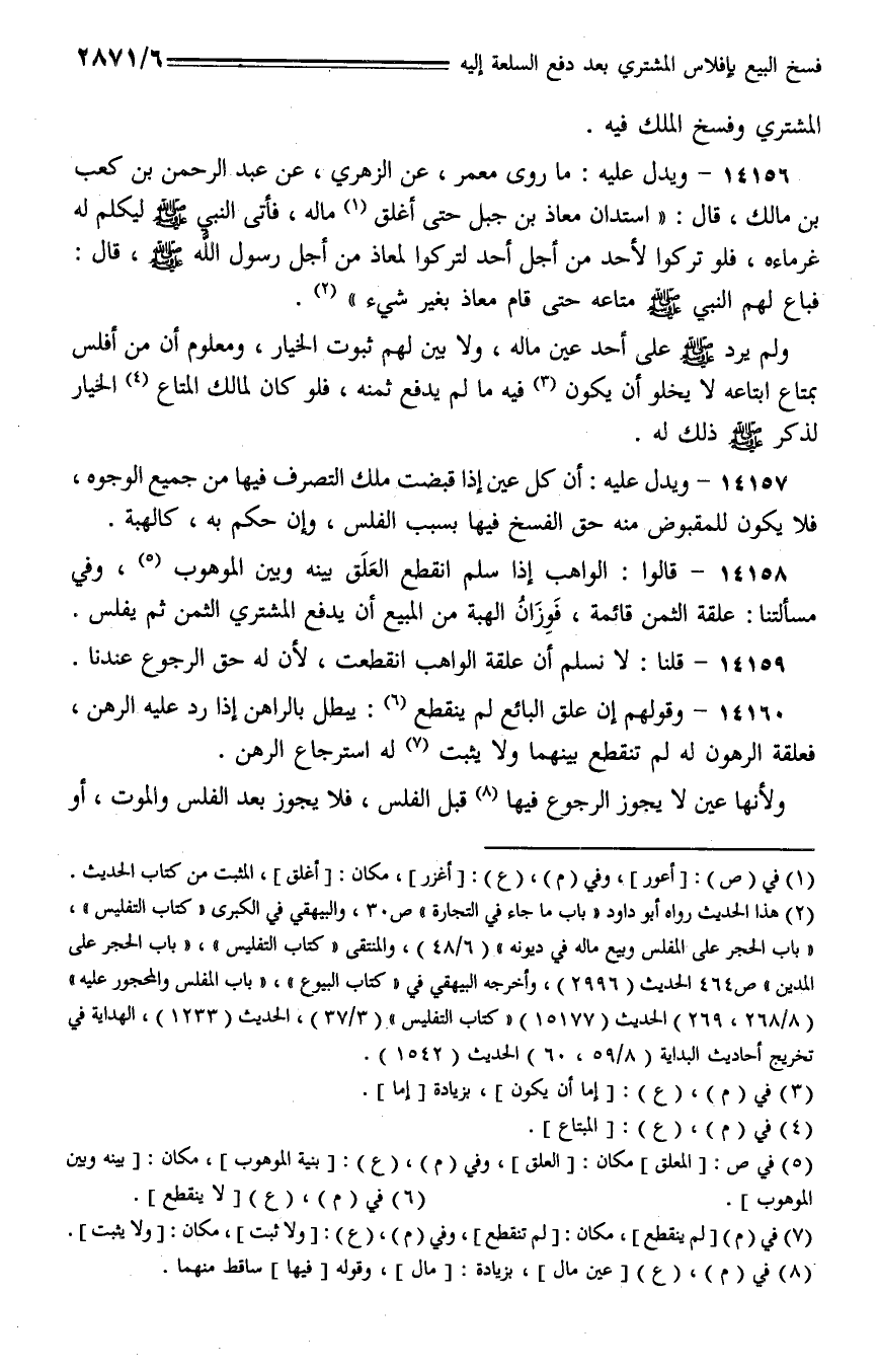 14158 - قالوا: الواهب إذا سلم انقطع العلق بينه وبين الموهوب، وفي مسألتنا: علقة الثمن قائمة، فوزان الهبة من المبيع أن يدفع المشتري الثمن ثم يفلس.