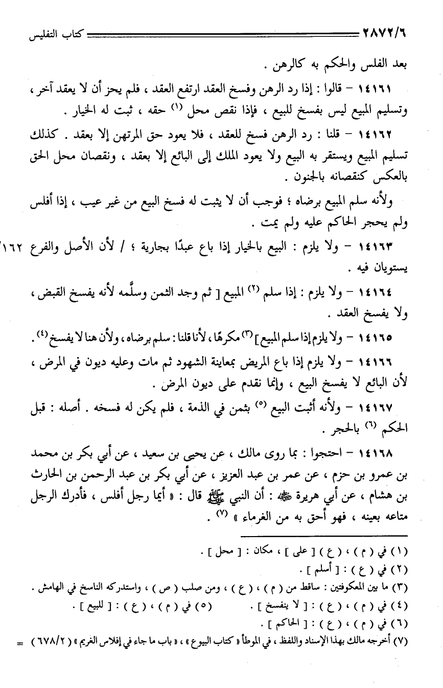 14168 - احتجوا: بما روى مالك، عن يحيى بن سعيد، عن أبي بكر بن محمد بن عمرو بن حزم، عن عمر بن عبد العزيز، عن أبي بكر بن عبد الرحمن بن الحارث بن هشام، عن أبي هريرة - رضي الله عنه -: أن النبي - صلى الله عليه وسلم - قال: (أيما رجل أفلس، فأدرك الرجل متاعه بعينه، فهو أحق به من الغرماء).