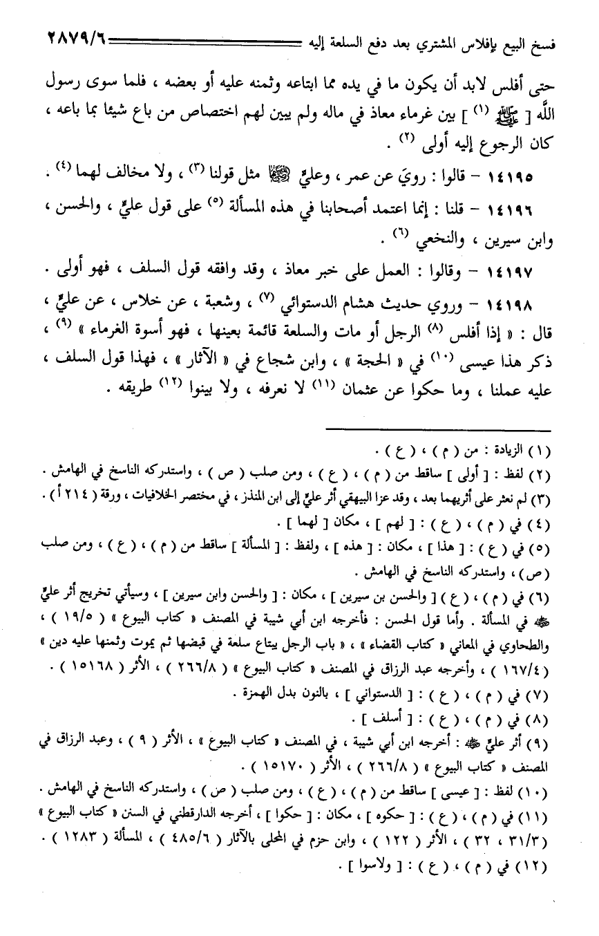 14198 - وروي حديث هشام الدستوائي، وشعبة، عن خلاس، عن علي، قال: (إذا أفلس الرجل أو مات والسلعة قائمة بعينها، فهو أسوة الغرماء)، ذكر هذا عيسى في (الحجة)، وابن شجاع في (الآثار)، فهذا قول السلف، عليه عملنا، وما حكوا عن عثمان لا نعرفه، ولا بينوا طريقه.