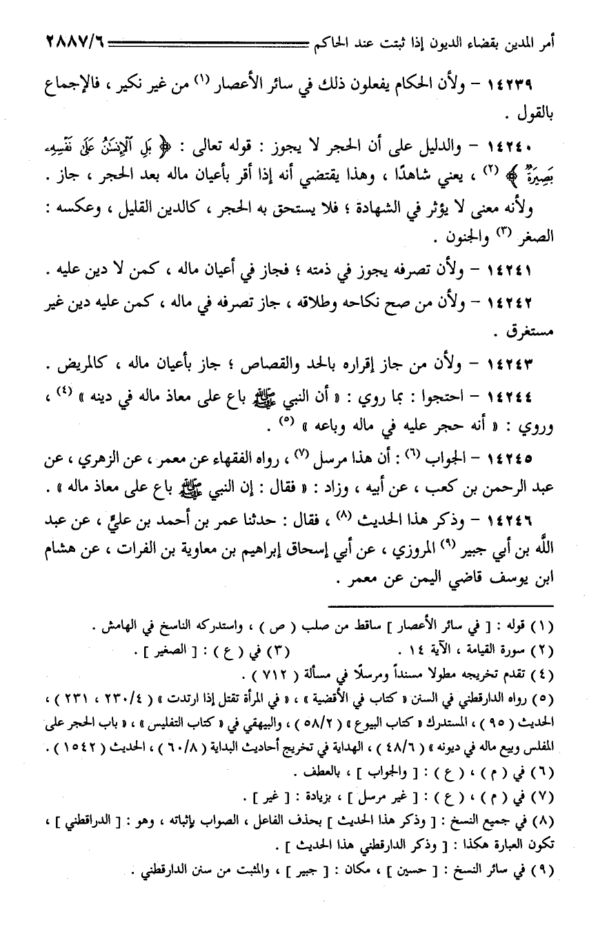 14240 - والدليل على أن الحجر لا يجوز: قوله تعالى: {بل الإنسان على نفسه بصيرة}، يعني شاهدا، وهذا يقتضي أنه إذا أقر بأعيان ماله بعد الجر، جاز.