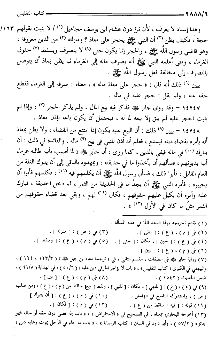 وهذا إسناد لا يعرف، لأن من دون هشام ابن يوسف مجاهيل/لا يثبت بقولهم 163/ب حجة، فكيف يظن أن النبي - صلى الله عليه وسلم - يحجر على معاذ؟ ومنزلته من الدين معروفة، وهو قاضي رسول الله - صلى الله عليه وسلم -، والحجر إنما يكون حتى لا يتصرف ويسقط حقوق الغرماء، ومتى أعلمه النبي - صلى الله عليه وسلم - أنه يصرف ماله إلى الغرماء ثم يظن بمعاذ أن يتوصل بالتصرف إلى مخالفة فعل رسول الله - صلى الله عليه وسلم -.