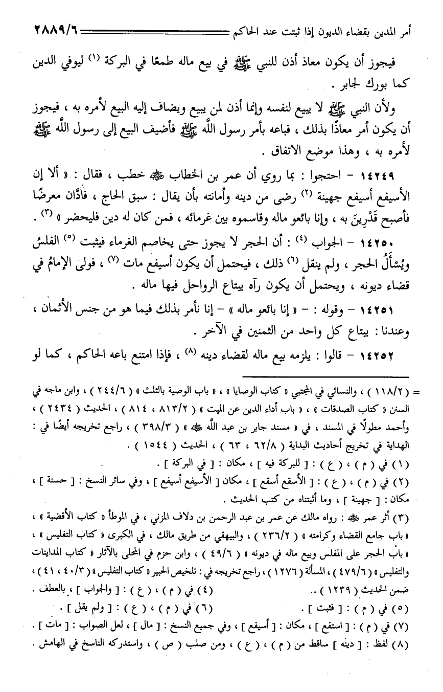 14249 - احتجوا: بما روي أن عمر بن الخطاب - رضي الله عنه - خطب، فقال: (ألا إن الأسيفع أسيفع جهينة رضى من دينه وأمانته بأن يقال: سبق الحاج، فادان معرضا فأصبح قدرين به، وإنا بائعو ماله وقاسموه بين غرمائه، فمن كان له دين فليحضر).