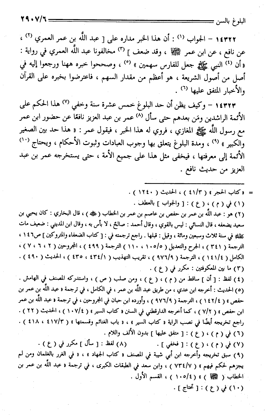 14322 - الجواب: أن هذا الخبر مداره على [عبد الله بن عمر العمري، عن نافع، عن ابن عمر رضي الله عنهم، وقد ضعف] مخالفونا عبد الله العمري في رواية: (أن النبي - صلى الله عليه وسلم - جعل للفارس سهمين)، وصححوا خبره ههنا ورجعوا إليه في أصل من أصول الشريعة، وهو أعظم من مقدار السهم، فاعترضوا بخبره على القرآن والأخبار المتفق عليها.