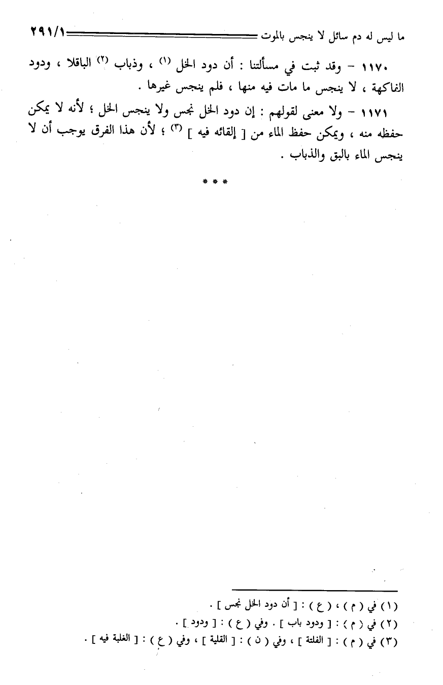 1171 - ولا معنى لقولهم: إن دود الخل نجس ولا ينجس الخل؛ لأنه لا يمكن حفظه منه، ويمكن حفظ الماء من إلقائه فيه؛ لأن هذا الفرق يوجب أن لا ينجس الماء بالبق والذباب.