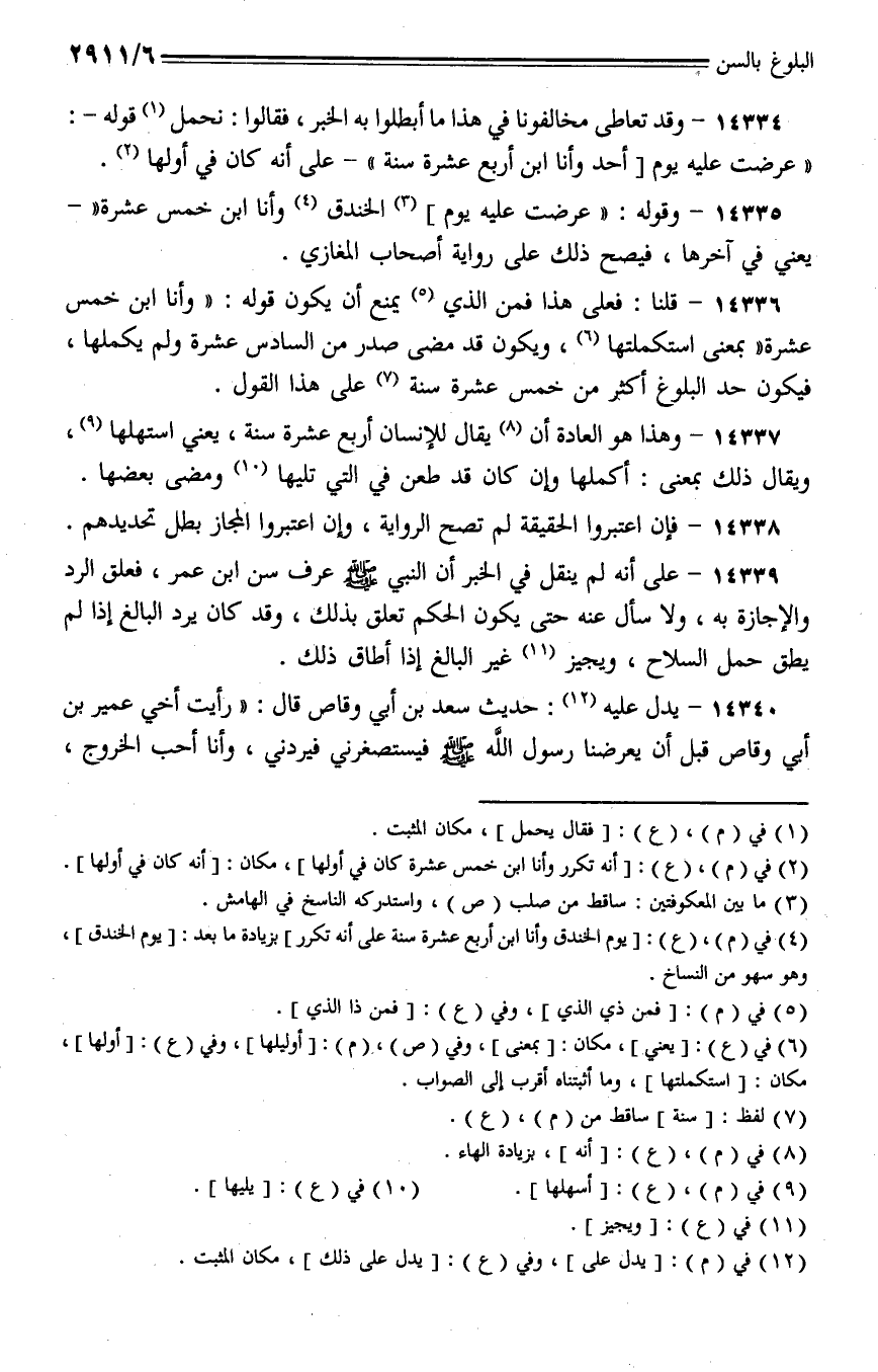 14334 - وقد تعاطى مخالفونا في هذا ما أبطلوا به الخبر، فقالوا: نحمل قوله-: (عرضت عليه يوم [أحد وأنا ابن أربع عشرة سنة) –على أنه كان في أولها.