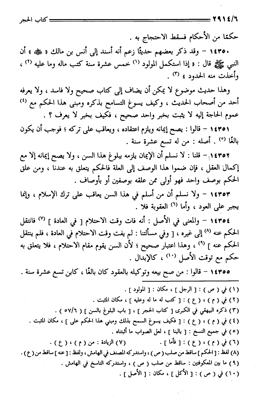 14350 - وقد ذكر بعضهم حديثا زعم أنه أسند إلى أنس بن مالك (- رضي الله عنه -) أن النبي - صلى الله عليه وسلم - قال: (إذا استكمل المولود خمس عشرة سنة كتب ماله وما عليه، وأخذت منه الحدود).
