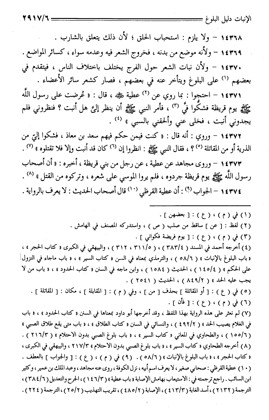 14371 - احتجوا: بما رو عن عطية - رضي الله عنه -، قال: (عرضت على رسول الله - صلى الله عليه وسلم - يوم قريظة فشكوا في، فأمر النبي - صلى الله عليه وسلم - أن ينظر إلى هل أنبت؟ فنظروني فلم يجدوني أنبت، فخلى عني وألحقني بالسبي).