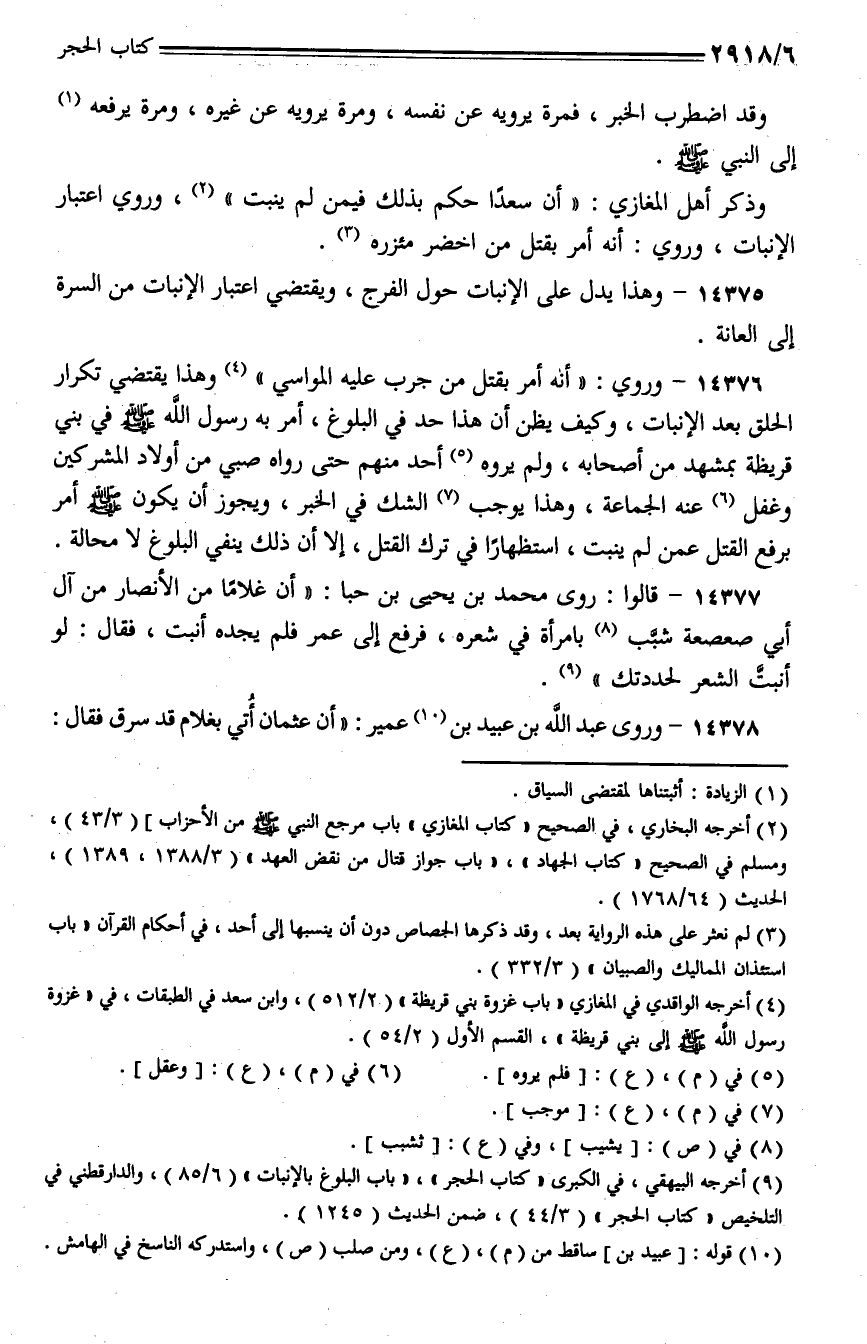 14376 - وروي: (أنه أمر بقتل من جرب عليه المواسي) وهذا يقتضي تكرار الحلق بعد الإنبات، وكيف يظن أن هذا حد في البلوغ، أمر به رسول الله - صلى الله عليه وسلم - في بني قريظة بمشهد من أصحابه، ولم يروه أحد منهم حتى رواه صبي من أولاد المشركين وغفل عنه الجماعة، وهذا يوجب الشك في الخبر، ويجوز أن يكون - صلى الله عليه وسلم - أمر برفع القتل عمن لم ينبت، استظهارا في ترك القتل، إلا أن ذلك ينفي البلوغ لا محالة.