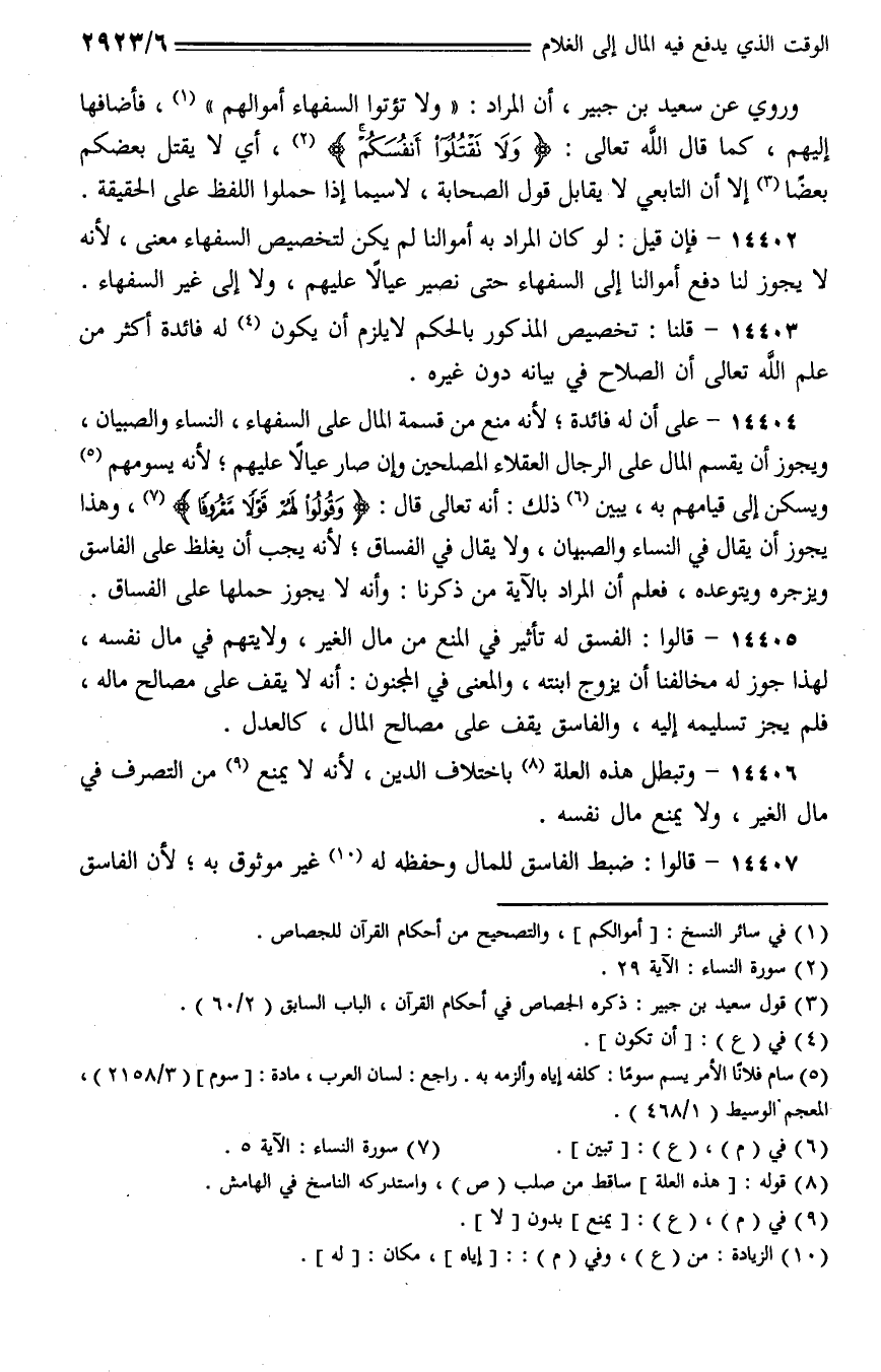 14404 - على أن له فائدة؛ لأنه منع من قسمة المال على السفهاء، النساء والصبيان، ويجوز أن يقسم المال على الرجال العقلاء المصلحين وإن صار عيالا عليهم؛ لأنه يسومهم ويسكن إلى قيامهم به، يبين ذلك: أنه تعالى قال: {وقولوا لهم قولا معروفا}، وهذا يجوز أن يقال في النساء والصبيان، ولا يقال في الفساق؛ لأنه يجب أن يغلط على الفاسق ويزجره ويتوعده، فعلم أن المراد بالآية من ذكرنا: وأنه لا يجوز حملها على الفساق.