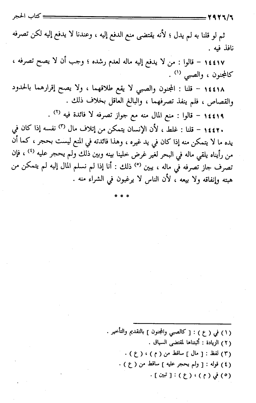 14417 - قالوا: من لا يدفع إليه ماله لعدم رشده؛ وجب أن لا يصح تصرفه، كالمجنون، والصبي.