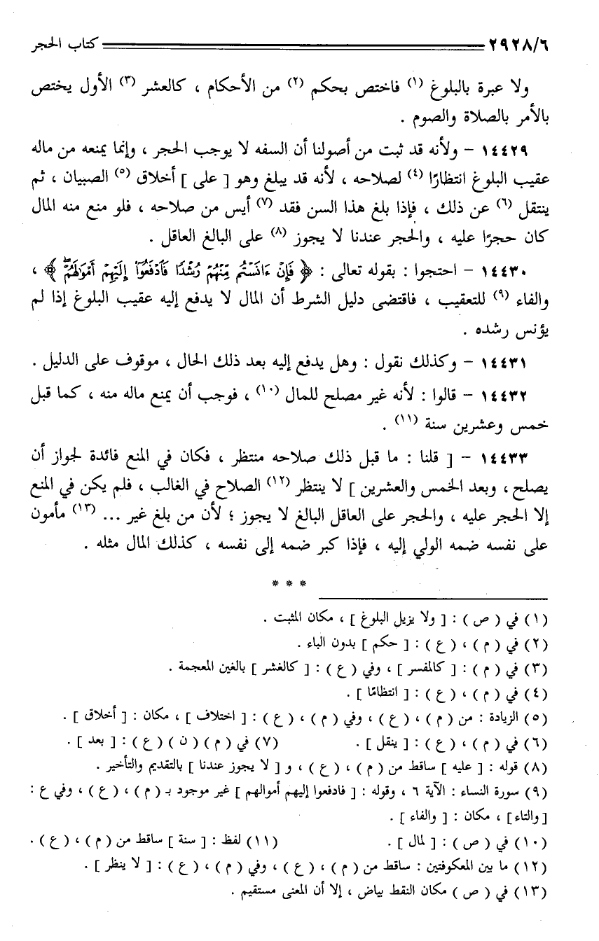 14430 - احتجوا: بقوله تعالى: {فإن أنستم منهم رشدا فادفعوا إليهم أموالهم}، والفاء للتعقيب، فاقتضى دليل الشرط أن المال لا يدفع أليه عقيب البلوغ إذا لم يؤنس رشده.