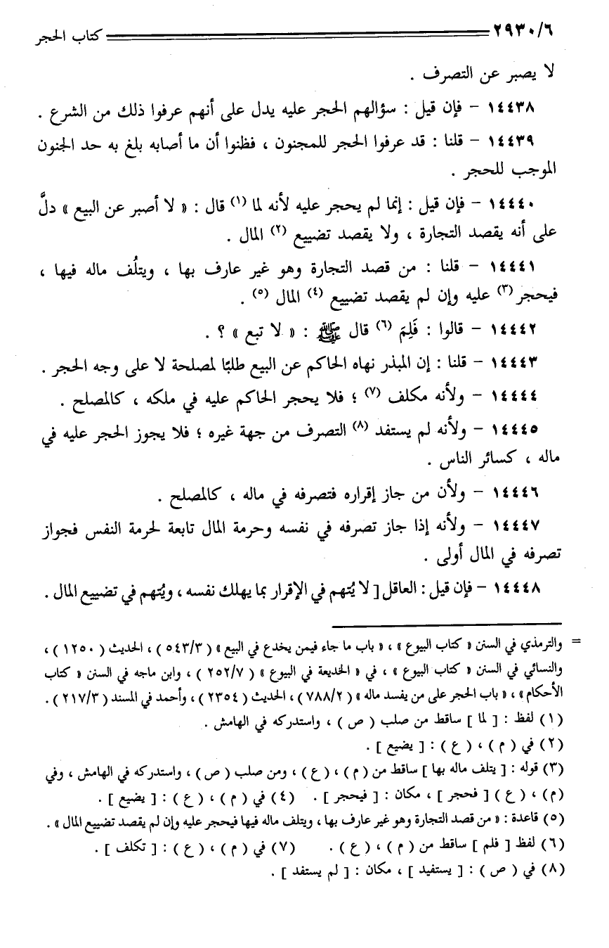 14443 - قلنا: إن المبذر نهاه الحاكم عن البيع طلبا لمصلحة لا على وجه الحجر.