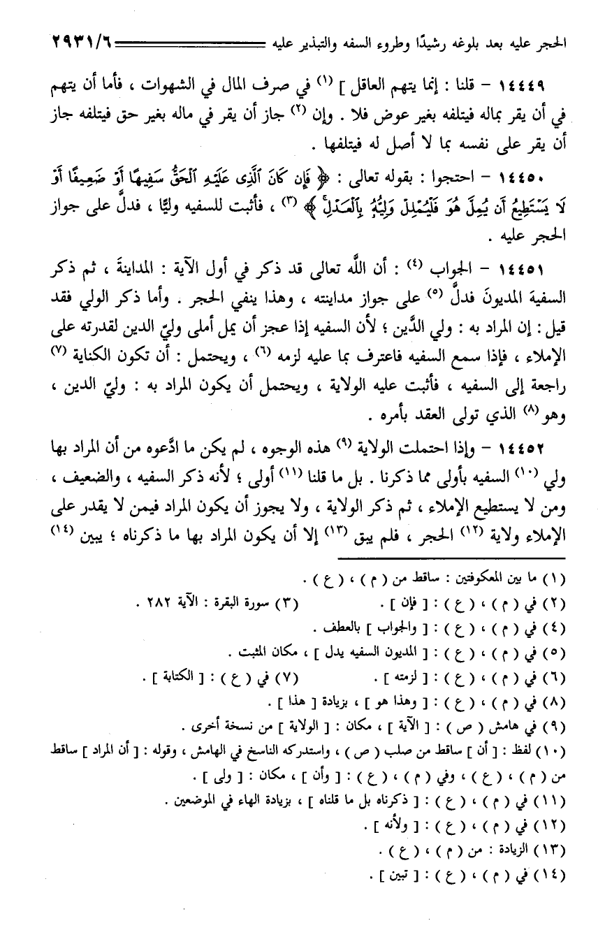 14450 - احتجوا: بقوله تعالى: {فإن كان الذي عليه الحق سفيهًا أو ضعيفًا أو لا يستطيع أن يمل فليمدل وليه بالعدل}، فأثبت للسفيه وليا، فدل على جواز الحجر عليه.