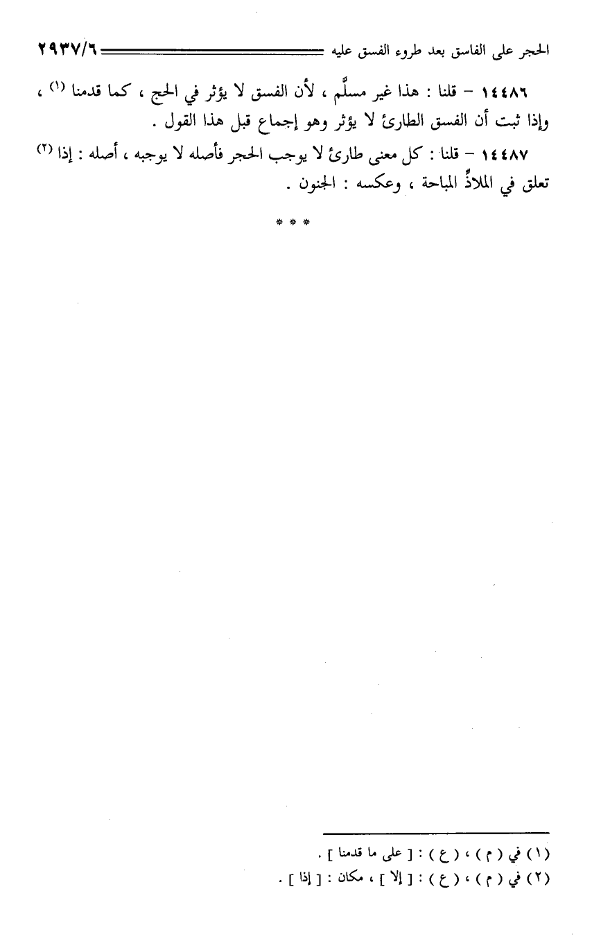 14487 - قلنا: كل معنى طارئ لا يوجب الحجر فأصله لا يوجبه، أصله: إذا تعلق في الملاذ المباحة، وعكسه: الجنون.