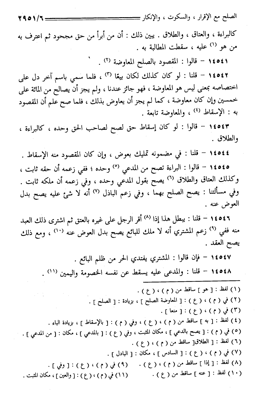 14545 - قالوا: البراءة تصح من المدعي وحده؛ ففي زعمه أن حقه ثابت، وكذلك العتاق والطلاق يصح بقول المدعي وحده، وفي زعمه أن ملكه ثابت.
