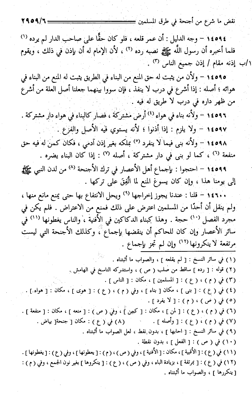 14595 - ولأن من يثبت له حق المنع من البناء في الطريق يثبت له المنع من البناء في هوائه؛ أصله: إذا أشرع في درب لا ينفذ، فإن سووا بينهما جعلنا أصل العلة من أشرع من ظهر داره في درب لا طريق له فيه.