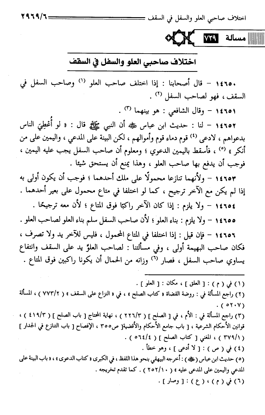 14652 - لنا: حديث ابن عباس - رضي الله عنه - أن النبي - صلى الله عليه وسلم - قال: (لو أعطي الناس بدعواهم، لادعى قوم دماء قوم وأموالهم، لكن البينة على المدعي، واليمين على من أنكر)، فأسقط باليمين الدعوي؛ ومعلوم أن صاحب السفل يجب عليه اليمين، فوجب أن يدفع بها صاحب العلو، وهذا يمنع أن يستحق شيًا.