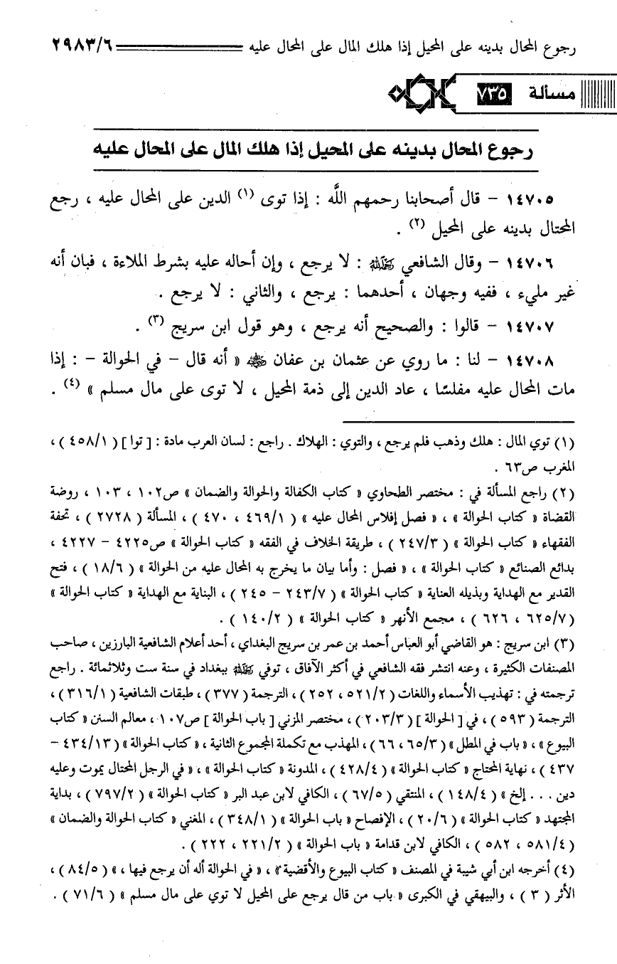 14708 - لنا: ما روي عن عثمان بن عفان - رضي الله عنه - (أنه قال- في الحوالة-: إذا مات المحال عليه مفلسًا، عاد الدين إلى ذمة المحيل، لا توى على مال مسلم).