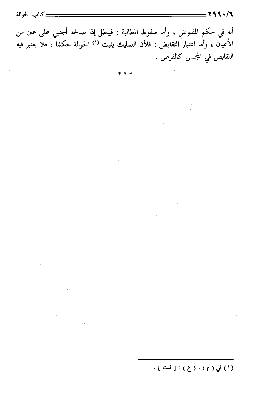 أنه في حكم المقبوض، وأما سقوط المطالبة: فيبطل إذا صالحه أجنبي على عين من الأعيان، وأما اعتبار التقابض: فلأن التمليك يثبت الحوالة حكمًا، فلا يعتبر فيه التقابض في المجلس كالقرض.