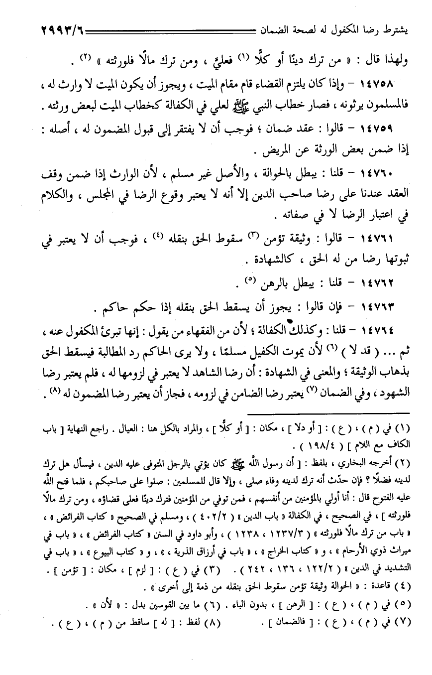 14758 - وإذا كان يلتزم القضاء قام مقام الميت، ويجوز أن يكون الميت لا وارث له، فالمسلمون يرثونه، فصار خطاب النبي - صلى الله عليه وسلم - لعلي في الكفالة كخطاب الميت لبعض ورثته.