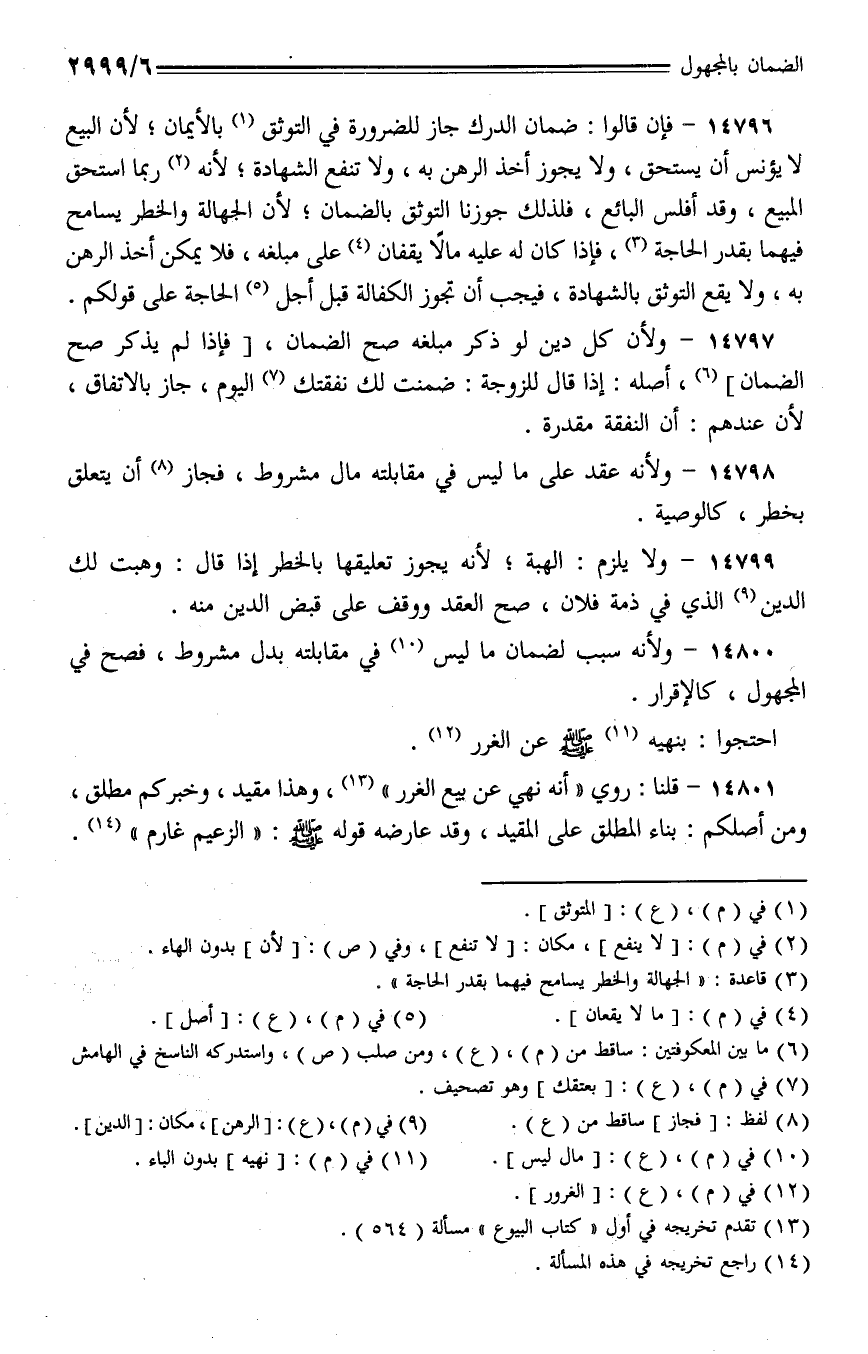 14797 - ولأن كل دين لو ذكر مبلغه صح الضمان، [فإذا لم يذكر صح الضمان]، أصله: إذا قال للزوجة: ضمنت لك نفقتك اليوم، جاز بالاتفاق، لأن عندهم: أن النفقة مقدرة.