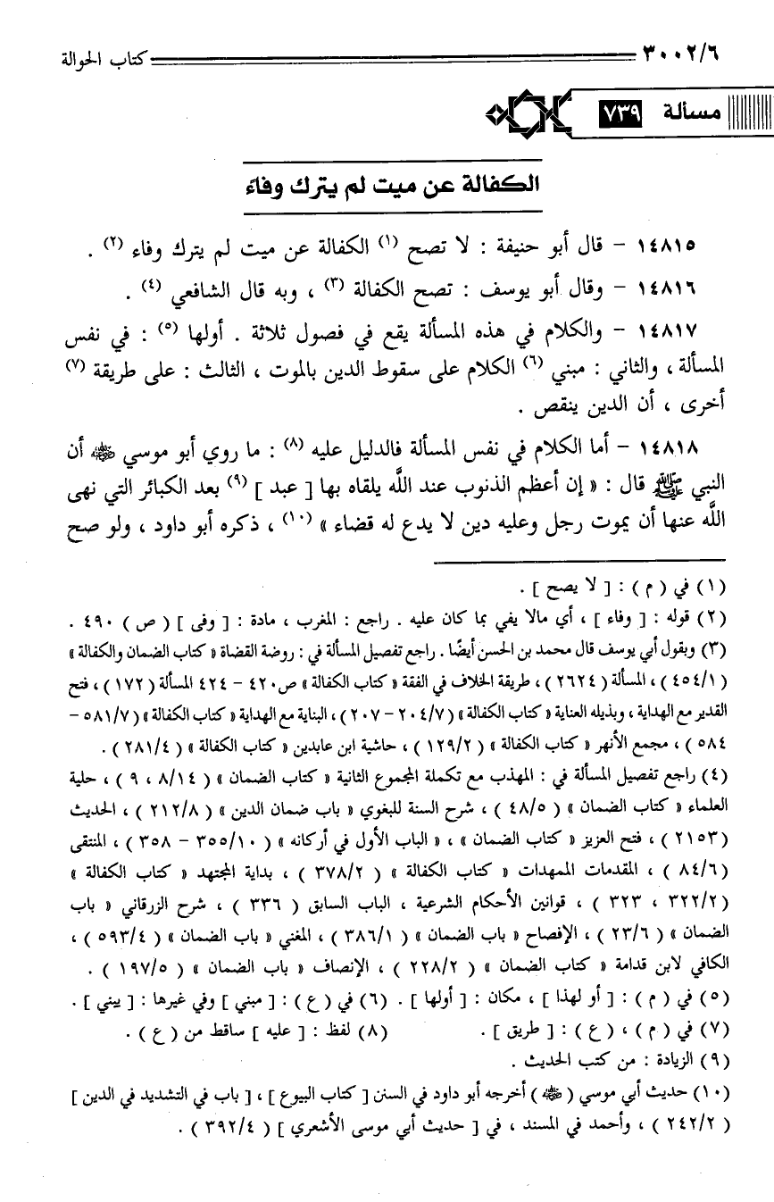 14817 - والكلام في هذه المسألة يقع في فصول ثلاثة. أولها: في نفس المسألة، والثاني: مبني الكلام على سقوط الدين بالموت، الثالث: على طريقة أخرى، أن الدين ينقص.