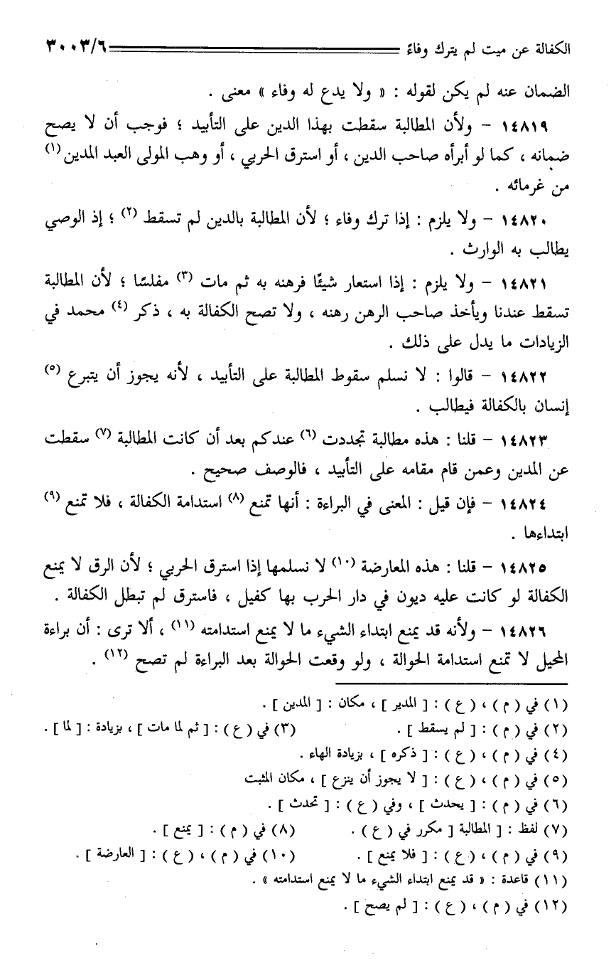 14819 - ولأن المطالبة سقطت بهذا الدين على التأييد، فوجب أن لا يصح ضمانه، كما لو أبرأه صاحب الدين، أو استرق الحربي، أو وهب المولى العبد المدين من غرمائه.