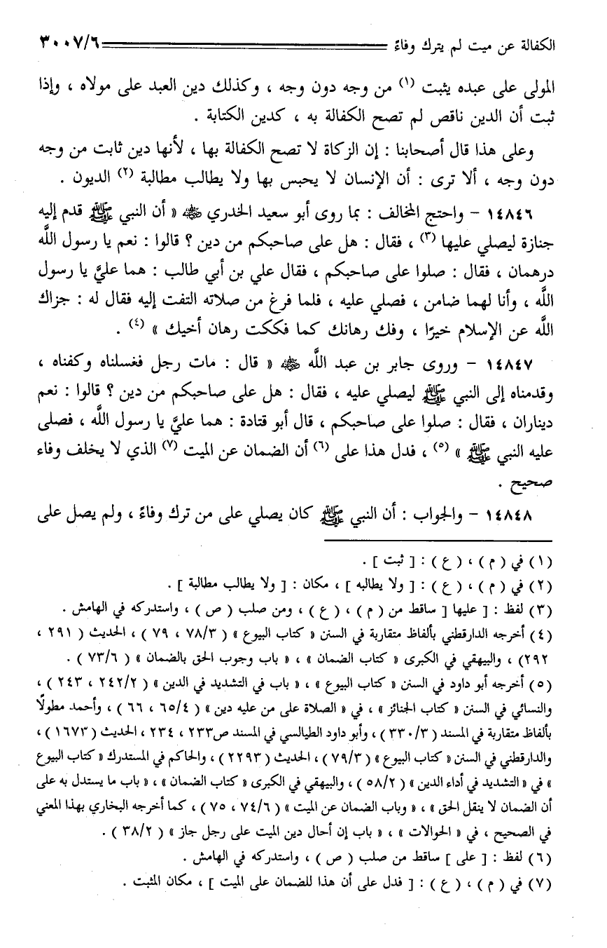 14846 - واحتج المخالف: بما روى أبو سعيد الخدري - رضي الله عنه - (أن النبي - صلى الله عليه وسلم - قدم إليه جنازة ليصلي عليها، فقال: هل على صاحبكم من دين؟ قالوا: نعم يا رسول الله درهمان، فقال: صلوا على صاحبكم، فقال علي بن أبي طالب: هما عليَّ يا رسول الله، وأنا لهما ضامن، فصلى عليه، فلما فرغ من صلاته التفت إليه فقال له: جزاك الله عن الإسلام خيرًا، وفك رهانك كما فككت رهان أخيك).