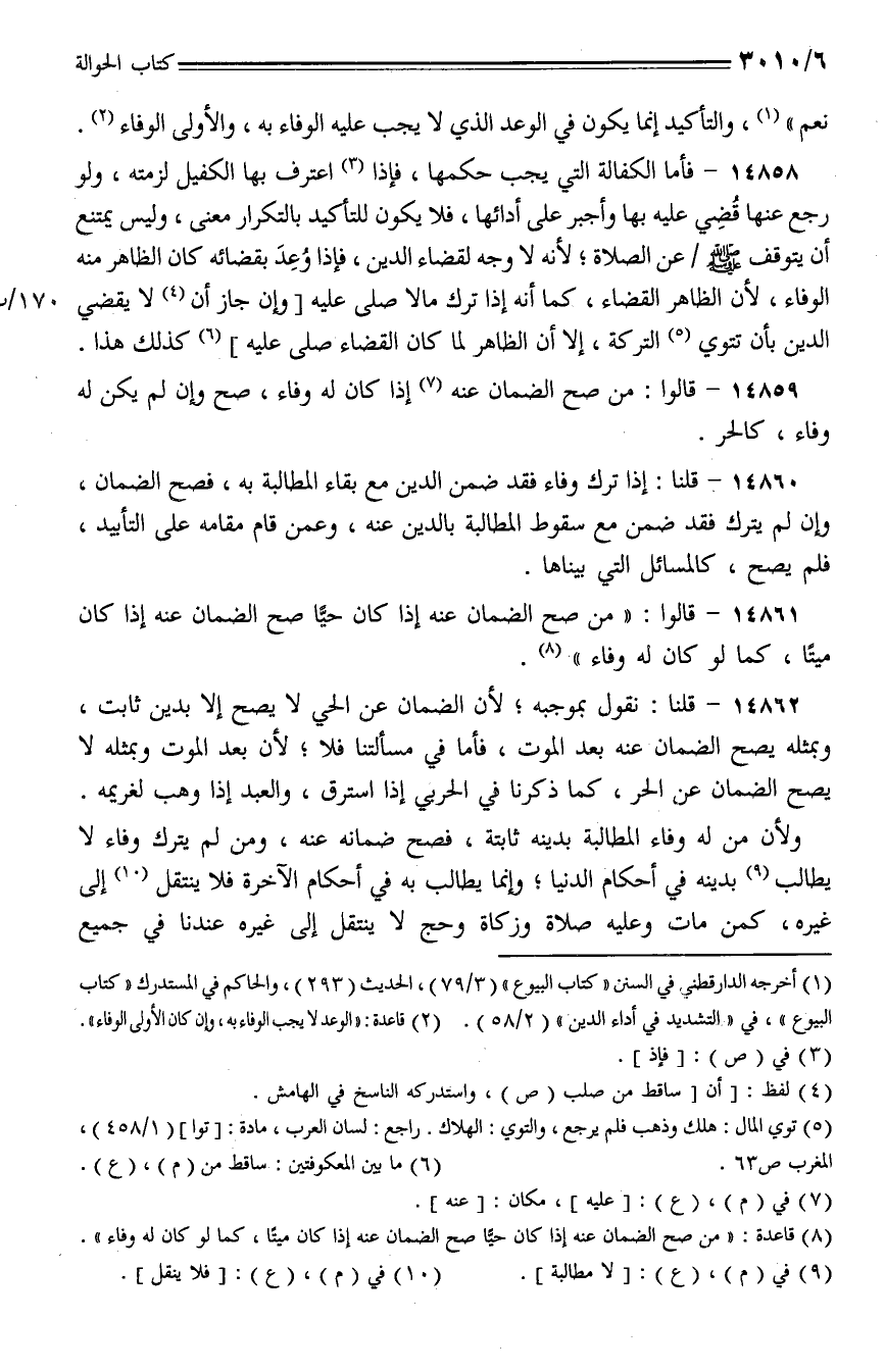 14860 - قلنا: إذا ترك وفاء فقد ضمن الدين مع بقاء المطالبة به، فصح الضمان، ولم يترك فقد ضمن مع سقوط المطالبة بالدين عنه، وعمن قام مقامه على التأييد، فلم يصح، كالسائل التي بيناها.