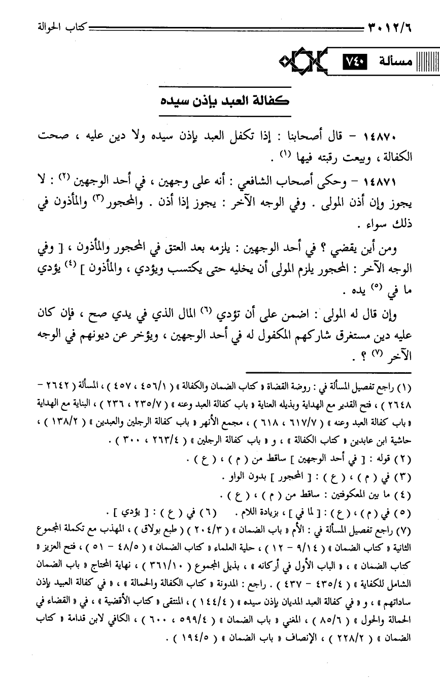 14870 - قال أصحابنا: إذا تكفل العبد فإذن سيده ولا دين عليه، صحت الكفالة، وبيعت رقبته فيها.