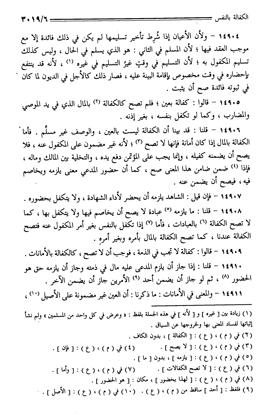 14906 - قلنا: قد بينا أن الكفالة ليست بالعين، والوصف غير مسلَّم. فأما الكفالة بالمال إذا كان أمانة فإنها لا تصح، لأنه غير مضمون على المكفول عنه، فلا يصح أن يضمنه كفيله، وإنما يجب على المؤتمن دفع يده، والتخلية بين المالك وماله، فإذا ضمن ضامن هذا المعنى صح، كما أن حضور المدعي معنى يلزمه ويخاصم فيه، فيصح أن يضمن عنه.