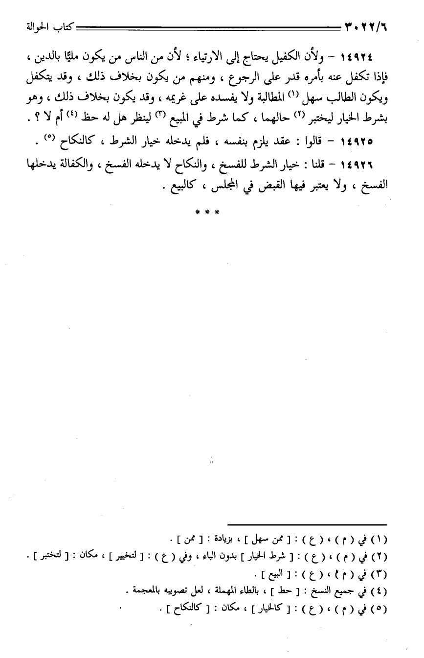 14926 - قلنا: خيار الشرط للفسخ، والنكاح لا يدخله الفسخ، والكفالة يدخلها الفسخ، ولا يعتبر فيها القبض في المجلس، كالبيع.