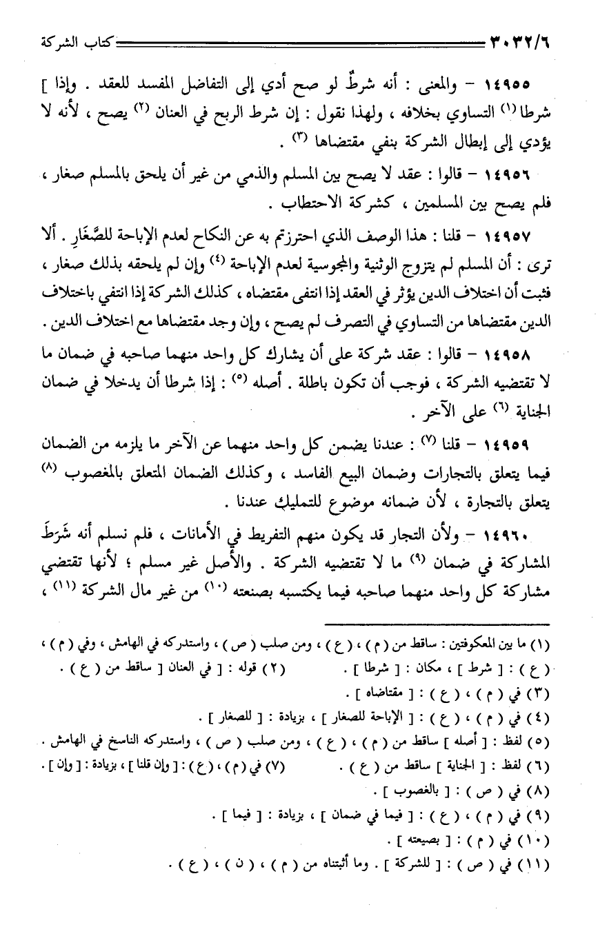 14958 - قالوا: عقد شركة على أن يشارك كل واحد منهما صاحبه في ضمان ما لا تقتضيه الشركة، فوجب أن تكون باطلة. أصله: إذا شرطا أن يدخلا في ضمان الجناية على الآخر.