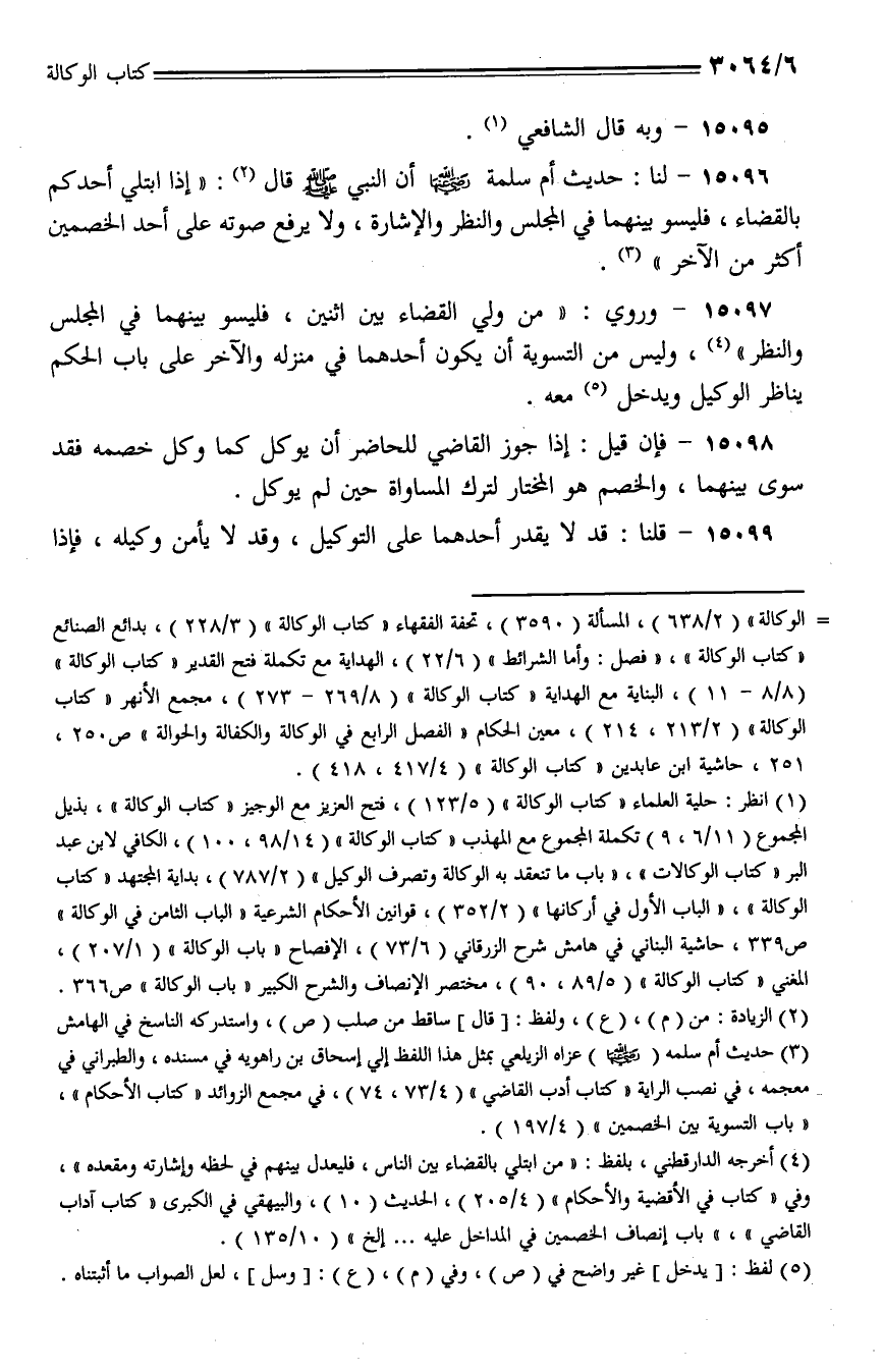 15097 - وروي: (من ولي القضاء بين اثنين، فليسو بينهما في المجلس والنظر)، وليس من التسوية أن يكون أحدهما في منزله والآخر على باب الحكم يناظر الوكيل ويدخل معه.