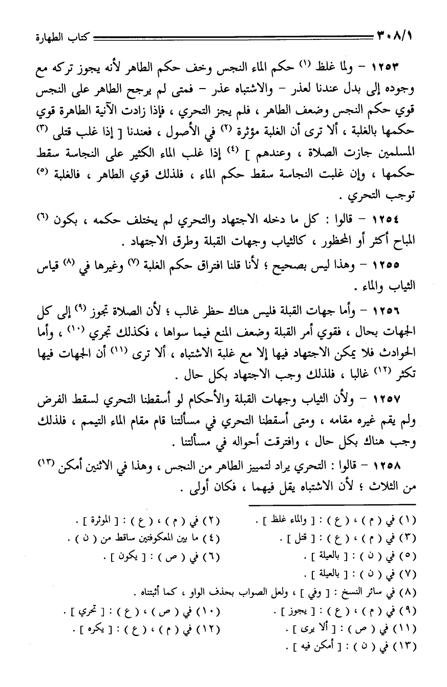 1253 - ولما غلظ حكم الماء النجس وخف حكم الطاهر لأنه يجوز تركه مع وجوده إلى بدل عندنا لعذر -والاشتباه عذر- فمتى لم يرجح الطاهر على النجس قوي حكم النجس وضعف الطاهر، فلم يجز التحري، فإذا زادت الآنية الطاهرة قوي المسلمين جازت الصلاة، وعندهم إذا غلب الماء الكثير على النجاسة سقط حكمها، وإن غلبت النجاسة سقط حكم الماء، فلذلك قوي الطاهر، فالغلبة توجب التحري.