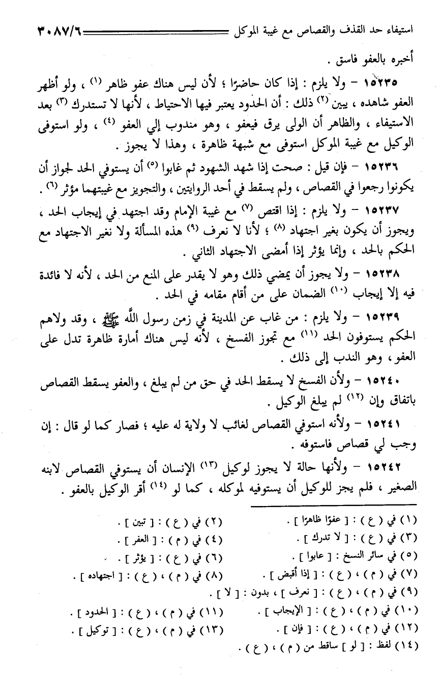 15235 - ولا يلزم: إذا كان حاضرًا؛ لأن ليس هناك عفو ظاهر، ولو أظهر العفو شاهده، يبين ذلك: أن الحدود يعتبر فيها الاحتياط، لأنها لا تستدرك بعد الاستيفاء، والظاهر أن الولي يرق فيعفو، وهو مندوب إلى العفو، ولو استوفي الوكيل مع غيبة الموكل استوفي مع شبهة ظاهرة، وهذا لا يجوز.
