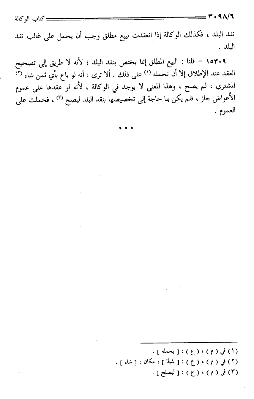 15309 - قلنا: البيع المطلق إنما يختص بنقد البلد؛ لأنه لا طريق على تصحيح العقد عند الإطلاق إلا أن نحمله على ذلك. ألا ترى: أنه لو باع بأي ثمن شاء المشتري، لم يصح، وهذا المعنى لا يوجد في الوكالة، لأنه لو عقدها على عموم الأعواض جاز، فلم يكن بنا حاجة إلى تخصيصها بنقد البلد ليصح، فحملت على العموم.