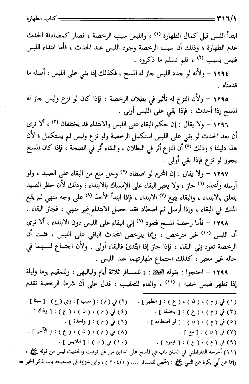 1299 - احتجوا: بقوله - عليه السلام -: ((للمسافر ثلاثة أيام ولياليهن، وللمقيم يوما وليلة إذا تطهر فلبس خفيه))، والفاء للتعقيب، فدل على أن شرط الرخصة تقدم