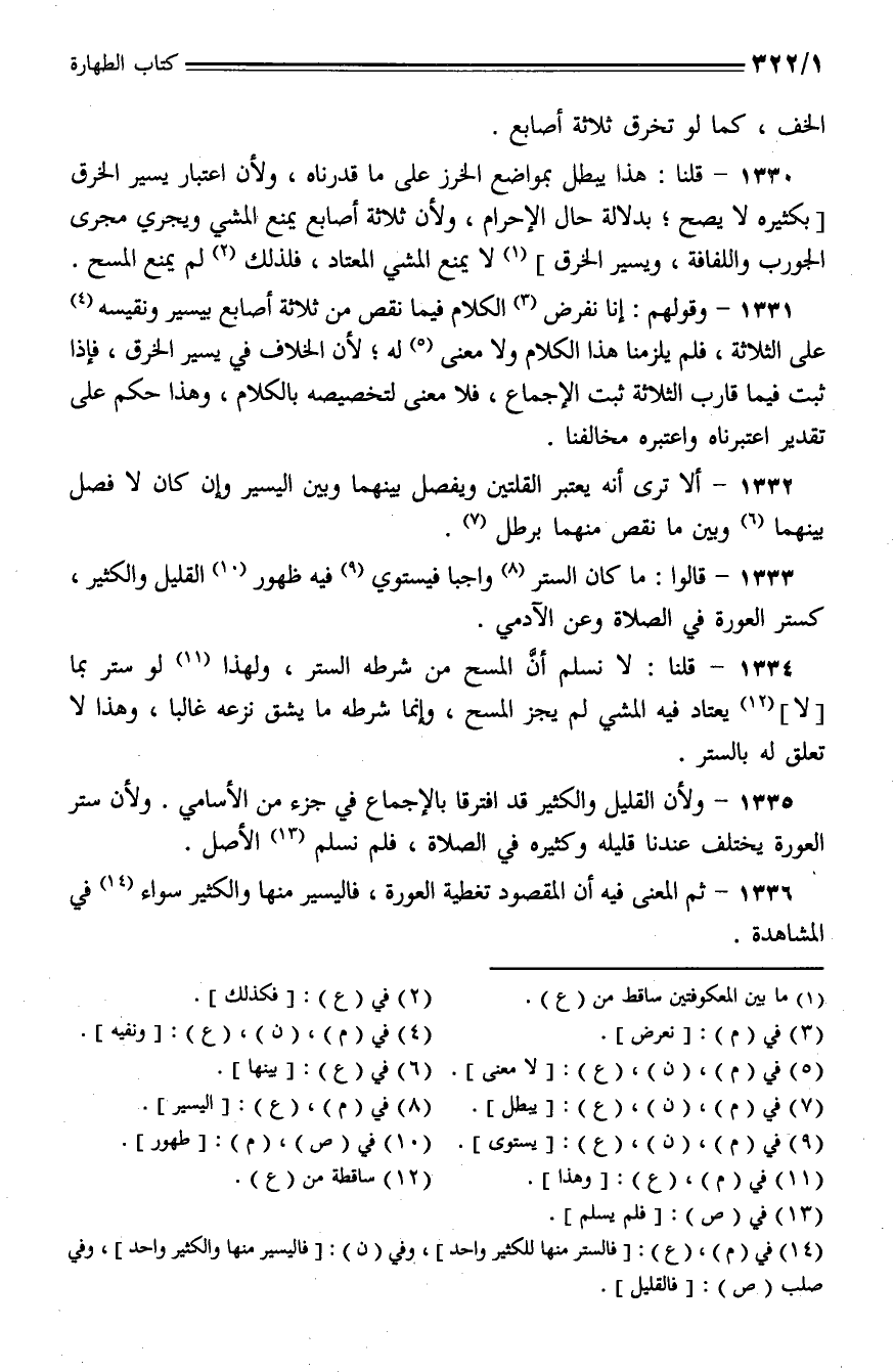 1331 - وقولهم: إنا نفرض الكلام فيما نقص من ثلاثة أصابع بيسير ونقيسه على الثلاثة، فلم يلزمنا هذا الكلام ولا معنى له؛ لأن الخلاف في يسير الخرق، فإذا ثبت فيما قارب الثلاثة ثبت الإجماع، فلا معنى لتخصيصه بالكلام، وهذا حكم على تقدير اعتبرناه واعتبره مخالفنا.