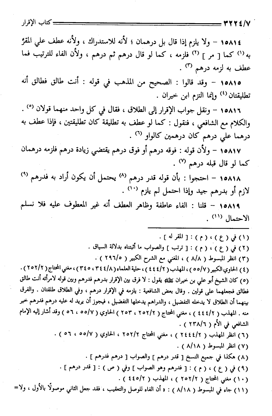 15816 - ونقل جواب الإقرار إلى الطلاق، فقال في كل واحد منهما قولان والكلام مع الشافعي، فنقول: كما لو عطف به تطليقة كان تطليقتين، فإذا عطف به درهما علي درهم كان درهمين كالواو.