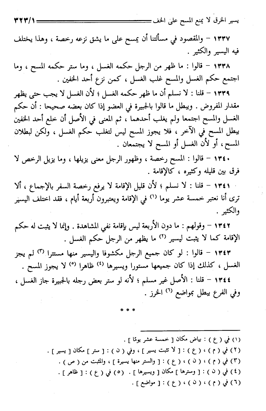 1340 - قالوا: المسح رخصة، وظهور الرجل معنى يزيلها، وما يزيل الرخص لا فرق بين قليله وكثيره، كالإقامة.