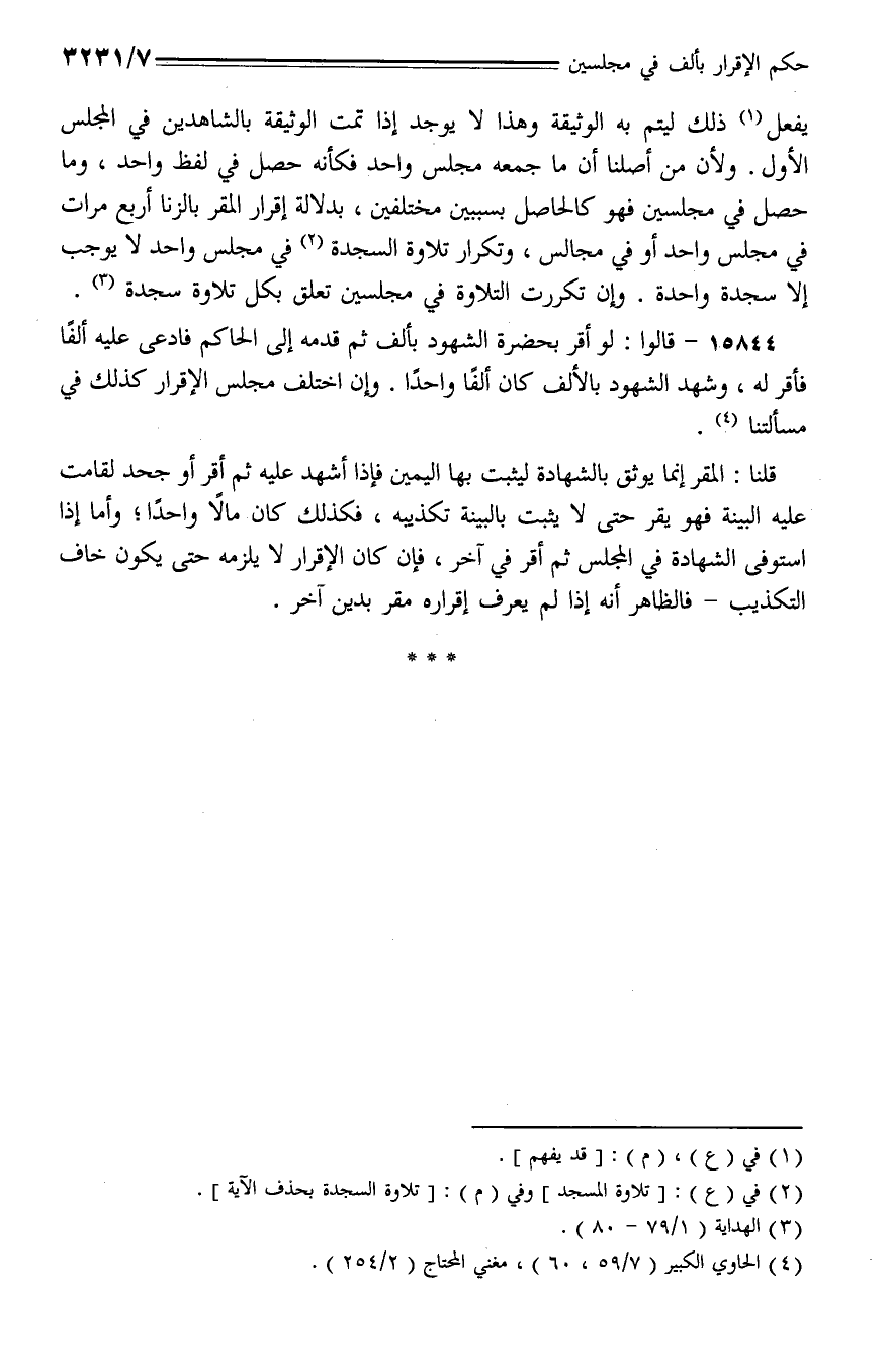 15844 - قالوا: لو أقر بحضرة الشهود بألف ثم قدمه إلى الحاكم فادعى عليه ألفًا فأقر له، وشهد الشهود بالألف كان ألفًا واحدًا. وإن اختلف مجلس الإقرار كذلك في مسألتنا.