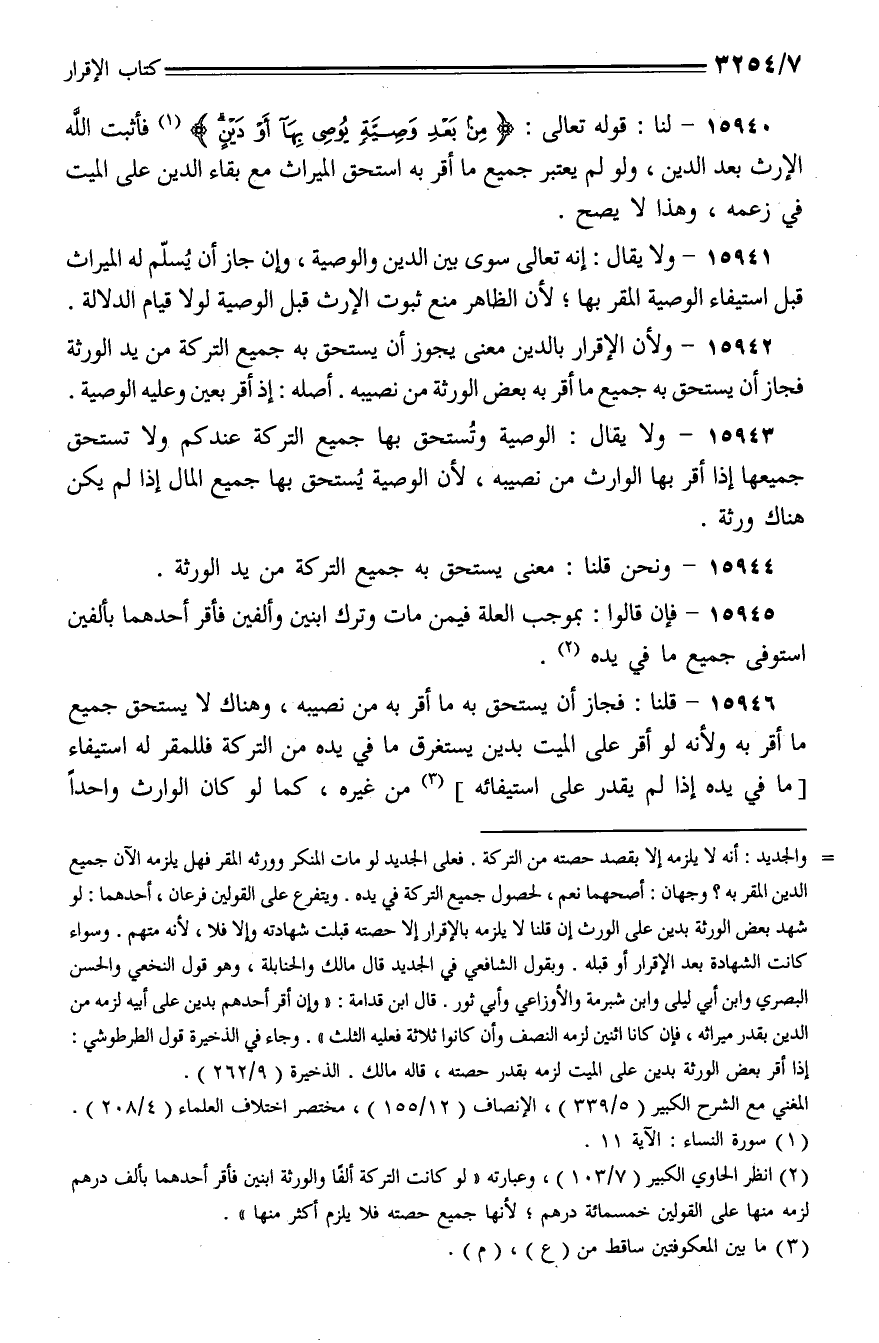 15940 - لنا: قوله تعالى: {من بعد وصية يوصى بها أو دين} فأثبت الله الإرث بعد الدين، ولو لم يعتبر جميع ما أقر به استحق الميراث مع بقاء الدين على الميت في زعمه، وهذا لا يصح.